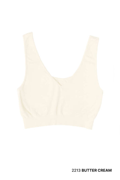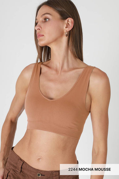 one size double layer reversible: u-neck or v-neck seamless 92% nylon, 8% spandex.