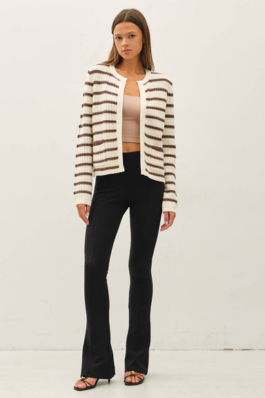 cardigan round neck long sleeves striped pattern open front pockets relaxed fit textured knit brown stripe 60% cotton, 40% acrylic