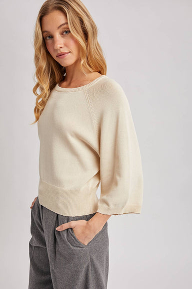 wide 3/4 sleeve round neck relaxed fit ribbed hemline lightweight, fine, smooth knit ecru color 89% viscose, 11% polyester