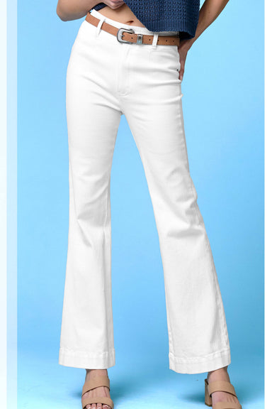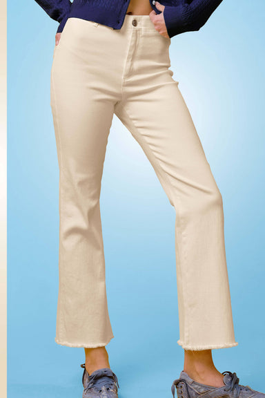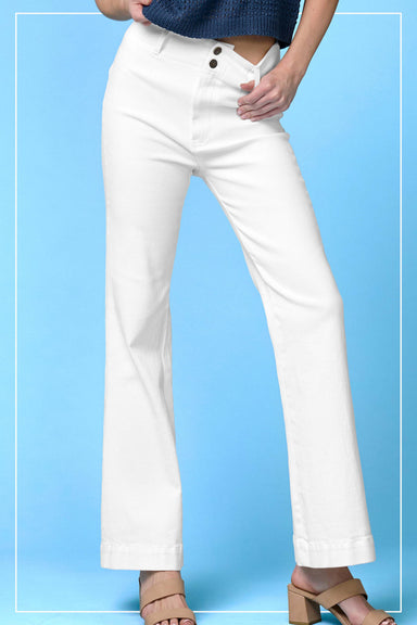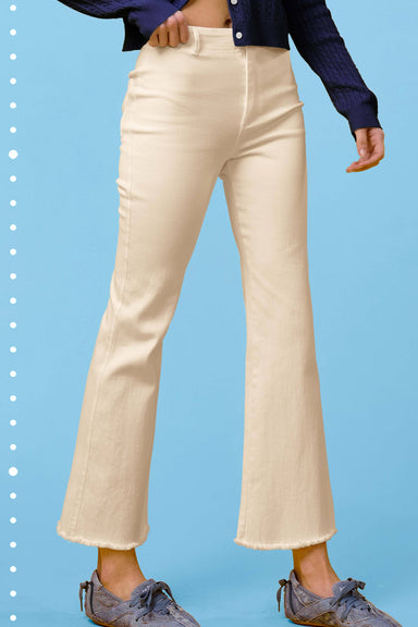 soft washed stretchy fabric high-rise belt loops back pockets flat front button closure wide leg ankle length cut edge hem