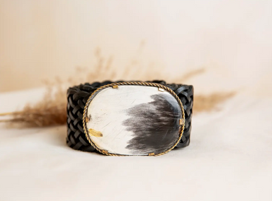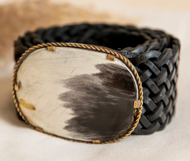 Braided belt made of genuine leather in black color. Its elongated brass buckle with mother-of-pearl stone in two shades is the ideal detail to com...