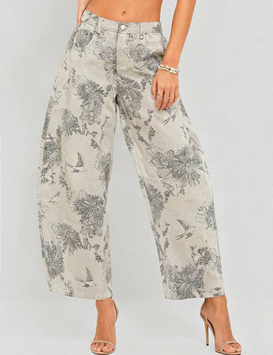 barrel style zip fly w/ button closure floral print relaxed fit front and back functional pockets color is white smoke