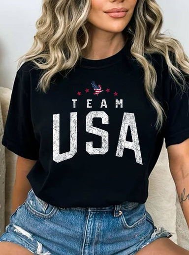 relaxed fit short sleeve crew neck straight hem 100% cotton black with white lettering and red and blue detail