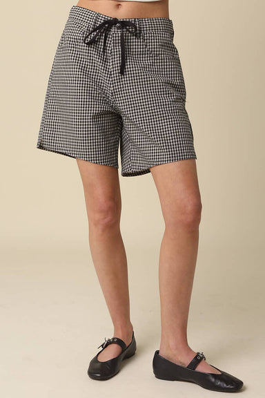 black and taup gingham hidden button fly lower rise functional drawstring 4 pockets wide leg for a flattering fit lightweight 100% cotton