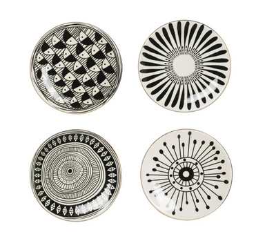 set of 4 4 styles in each set stoneware patterned w/ gold electroplating black & white 5 1/4” round