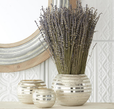 silver mercury glass etched stripes use as vase, candle holder, etc choose: small - 4” x 5" medium - 5” x 6.5" large - 7” x 9"