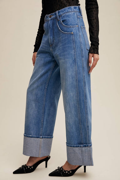 structured fit belt loops zipper 5 pocket style, actually double front pockets wide leg relaxed fit deep cuff vintage wash